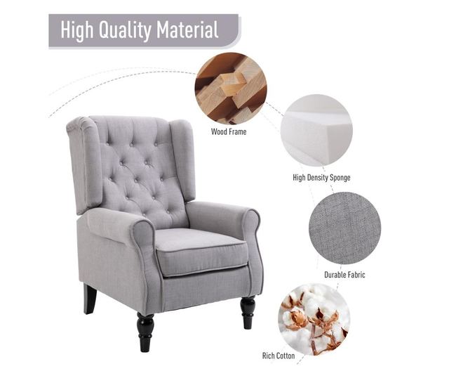Add style and character to your decor with this French-style armchair from HomCom. Bring a touch of elegance to your home with this fantastic piece of furniture: thanks to the quilted cushions, wooden legs and super padded seat, you won't have to give up comfort. The cushion covers are made of a very soft and breathable fabric that can be easily removed. Pair your armchair with colorful upholstery to give it a striking look! Have fun, play with your furniture and reinvent your environment with this fantastic piece of furniture. - French-style armchair, perfect for living room, bedroom, office or meeting room;- Quilted cushion covers in breathable material;- Extra padded seat and enveloping backrest for maximum comfort;- Removable cushion covers for easy washing;- 4 elegantly finished and painted wooden legs;- Easy to assemble;- Perfect for reading and relaxing;- TB117 fire-retardant certified padding. - Color: Grey;- Material: fabric, wood, foam;- Overall dimensions: 74 W x 86 D x 102 H cm;- Seat dimensions: 53 W x 48.5 H cm;- Seat height from the ground: 47 cm;- Backrest dimensions: 67W x 15W x 68H cm Armrest height from the ground: 60.5 cm Maximum load: 160 kg.;- Net weight: 21.5 kg. - 1 x club sofa chair 1 x manual