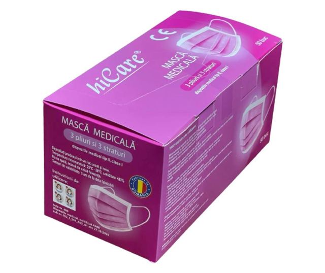 Кутия с 50 медицински маски BFE > 99%, 3 слоя, 3 гънки, метална пръчка, розова, CE сертификат