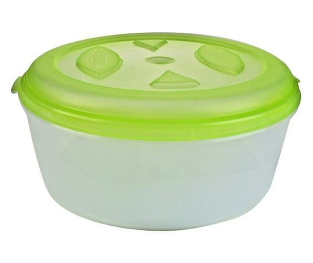 Този голям кръгъл контейнер за храна е идеален за транспортиране или съхранение на храна. Изработен от полипропилен, той може да издържа на температури от -40C до +120C, което го прави подходящ както за микровълново нагряване, така и за съхранение във фризер. С размери 10 см височина и 18,5 см в диаметър, той е чудесен и за транспортиране на храна. Контейнерът разполага с капак, който създава почти херметично затваряне, предотвратявайки миризми и разливи.