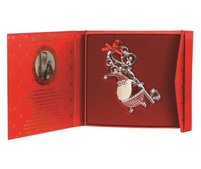Елегантна метална украса в кутия с Дядо Коледа и вълшебния ключ. Подходяща за всички възрасти и идеална за коледни поводи. Този артикул е част от нашата гама елегантни коледни украси, на цена между 50 - 74.99 лв. Идеална за подарък за приятели, колеги, братя и сестри, партньори, родители, лели, кръстници, племенници, шефове и братовчеди. Изработена от картон и метал в многоцветен дизайн.