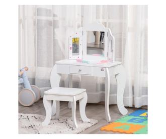Homcom Детска тоалетка с дървена табуретка, маса за гримиране с тристранно огледало и чекмедже