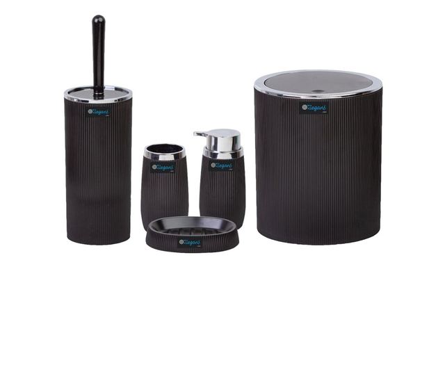 Комплект за баня от 5 части, с елегантен и изчистен дизайн. Удобен и практичен за употреба, както и много лесен за почистване. Изработен от висококачествена пластмаса, издръжлива в различни среди. Комплектът съдържа дозатор за течен сапун, поставка за четки и паста за зъби, сапунерка, четка за тоалетна, и кошче за отпадъци. Цвят: Черен/Хром Размери: Дозатор за течен сапун - Ф8 х 15,8 см Поставка за четки и паста за зъби - Ф7,3 х 13 см Сапунерка - 12,6 х 9 х 2,7 см Четка за тоалетна - Ф10,2 х 34,2 см Кошче за отпадъци - Ф19 х 22,3 см (5л)