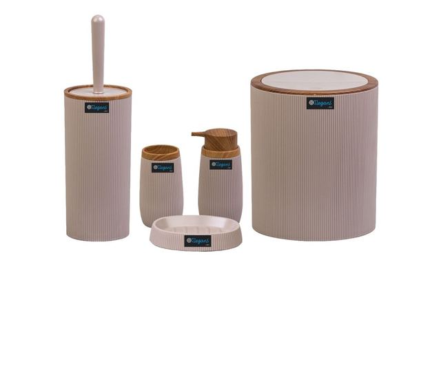 Комплект за баня от 5 части, с елегантен и изчистен дизайн. Удобен и практичен за употреба, както и много лесен за почистване. Изработен от висококачествена пластмаса, издръжлива в различни среди. Комплектът съдържа дозатор за течен сапун, поставка за четки и паста за зъби, сапунерка, четка за тоалетна, и кошче за отпадъци. Цвят: Бежов/Дървен ефект Размери: Дозатор за течен сапун - Ф8 х 15,8 см Поставка за четки и паста за зъби - Ф7,3 х 13 см Сапунерка - 12,6 х 9 х 2,7 см Четка за тоалетна - Ф10,2 х 34,2 см Кошче за отпадъци - Ф19 х 22,3 см (5л)