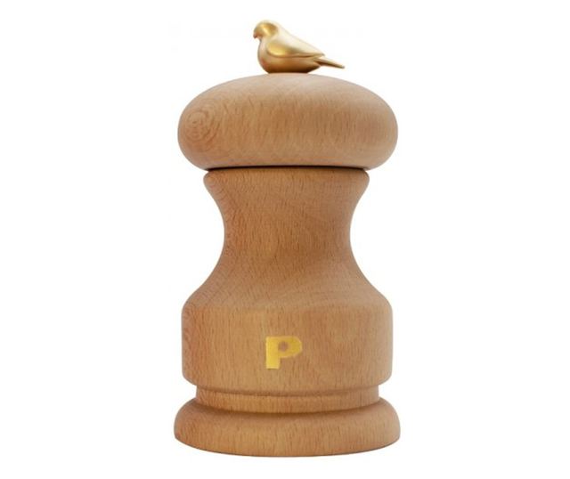 Със специални покрития, мелничката за пипер Bird Natural е висока само 11 см и представлява почит към природата чрез естествения вид, придаден от буковата дървесина, от която е изработена, но също и чрез бутона, който позволява прецизна настройка на желаното смилане, който изобразява златна птица, отличителен и луксозен елемент
