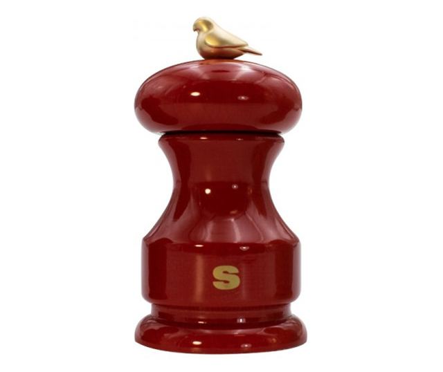 Със специални покрития, мелничката за сол Bird Red е висока само 11 см и представлява почит към природата чрез естествения вид, придаден от червеното лакирано буково дърво, но също и чрез бутона, който позволява прецизно регулиране на желаното смилане, илюстрирайки златна птица, отличителен и луксозен елемент.