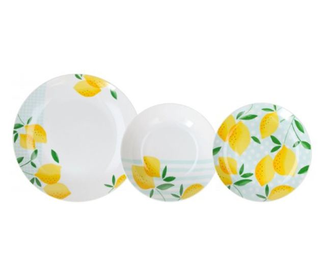 В ярки нюанси и със средиземноморски принт, базиран на безспорната красота на лимоните, комплектът за хранене Limone съдържа 18 части с 3 различни концепции за дизайн, така че да могат да се комбинират, за да създадат хармония на масата чрез разнообразие.
