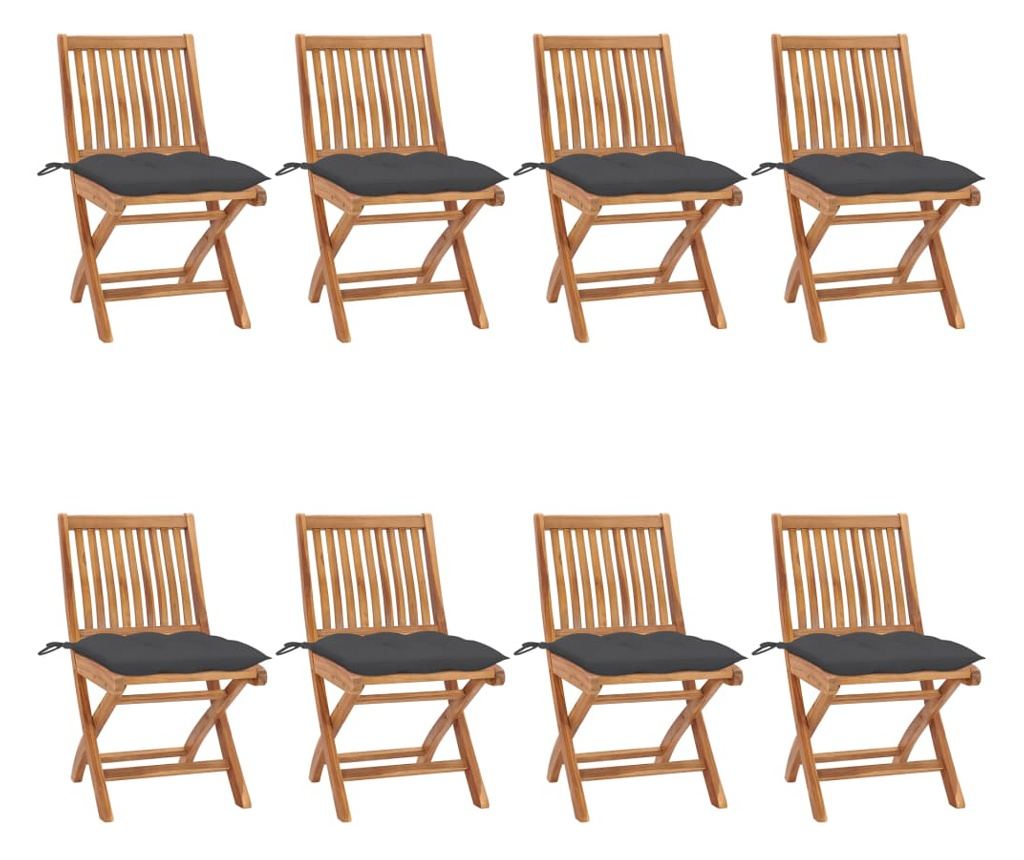 Изработен от изключително издръжлива масивна тикова дървесина, този комплект мебели е обработен, сушен в пещ и след това фино шлифован, за да се осигури много гладък вид. Тиковото дърво е известно със своята изключителна издръжливост и устойчивост на атмосферни влияния, поради което е много по-подходящо за градински мебели от всеки друг вид дървесина. Тиковото дърво е перфектният избор, ако искате да закупите дълготрайни градински мебели. Благодарение на шлифованата повърхност, столовете за хранене са устойчиви на атмосферни влияния и лесни за почистване. Също така могат да бъдат сгънати, за да се спести място за съхранение, когато не се използват. Освен това, включените възглавници осигуряват допълнителен комфорт. Всяка възглавница има 2 комплекта връзки за по-добро закрепване към стола.