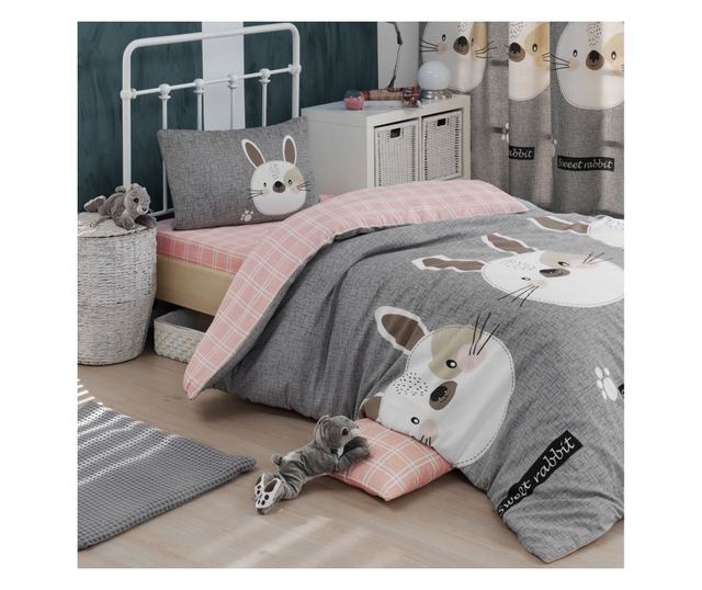 Детски спален комплект Eponj Home 143EPJ1795, 3 части, Плик 160x220, Чаршаф 160x240, Калъфка 50х70, Памук/полиестер, Сив/розов
