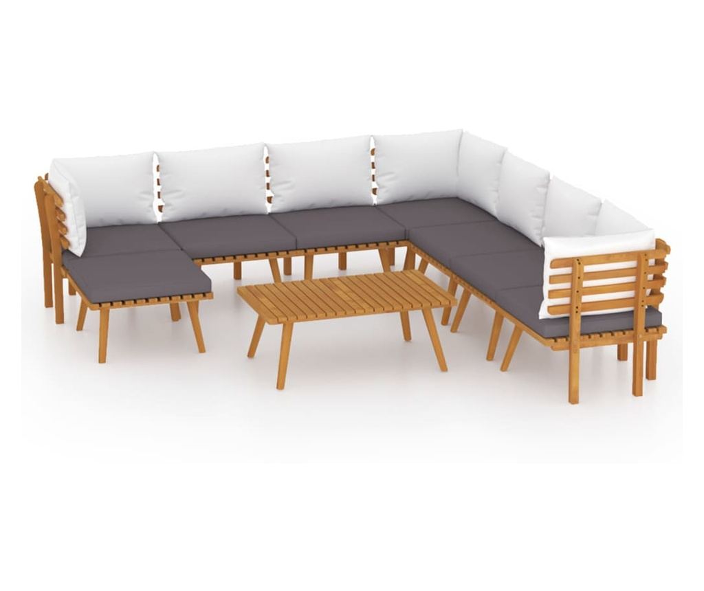 Изработен от масивно акациево дърво, комплектът градински мебели е устойчив на атмосферни влияния и много издръжлив. Комбиниран с дебело подплатени възглавници, този лаундж комплект за вътрешен двор осигурява оптимален комфорт. Можете да го съчетаете с други модулни сегменти, за да създадете ваши собствени конфигурации на градински лаундж комплект!