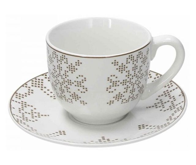 Atollo Retro внася традиционни дантелени мотиви в порцеланови чаши в комплект от 4 броя по 230 ml, подходящи за празнични маси, като златните нюанси добавят нотка изтънченост, за да можете да се насладите на кафе, чай, горещ шоколад и всяка друга топла напитка по елегантен начин