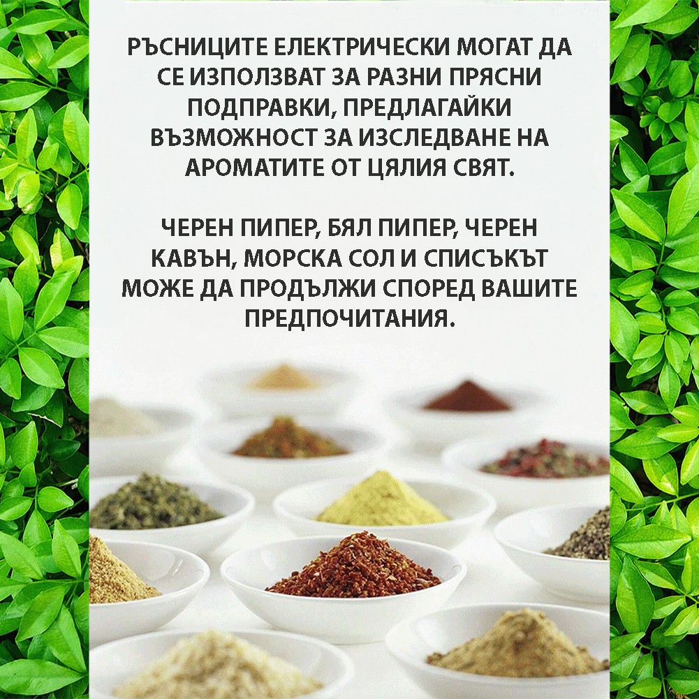 Версатилност за различни подправки: Двете мелачки могат да бъдат използвани за разнообразие от подправки като бял пипер, черен пипер, морска сол, карамфил и други, като осигуряват гъвкавост в кухнята и улесняват приготвянето на различни рецепти.