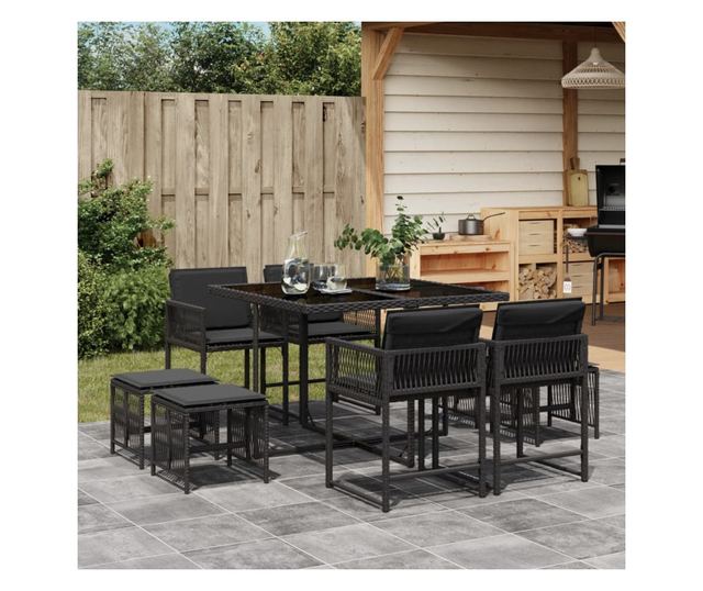 Градински трапезен комплект възглавници 9 части черен полиратан