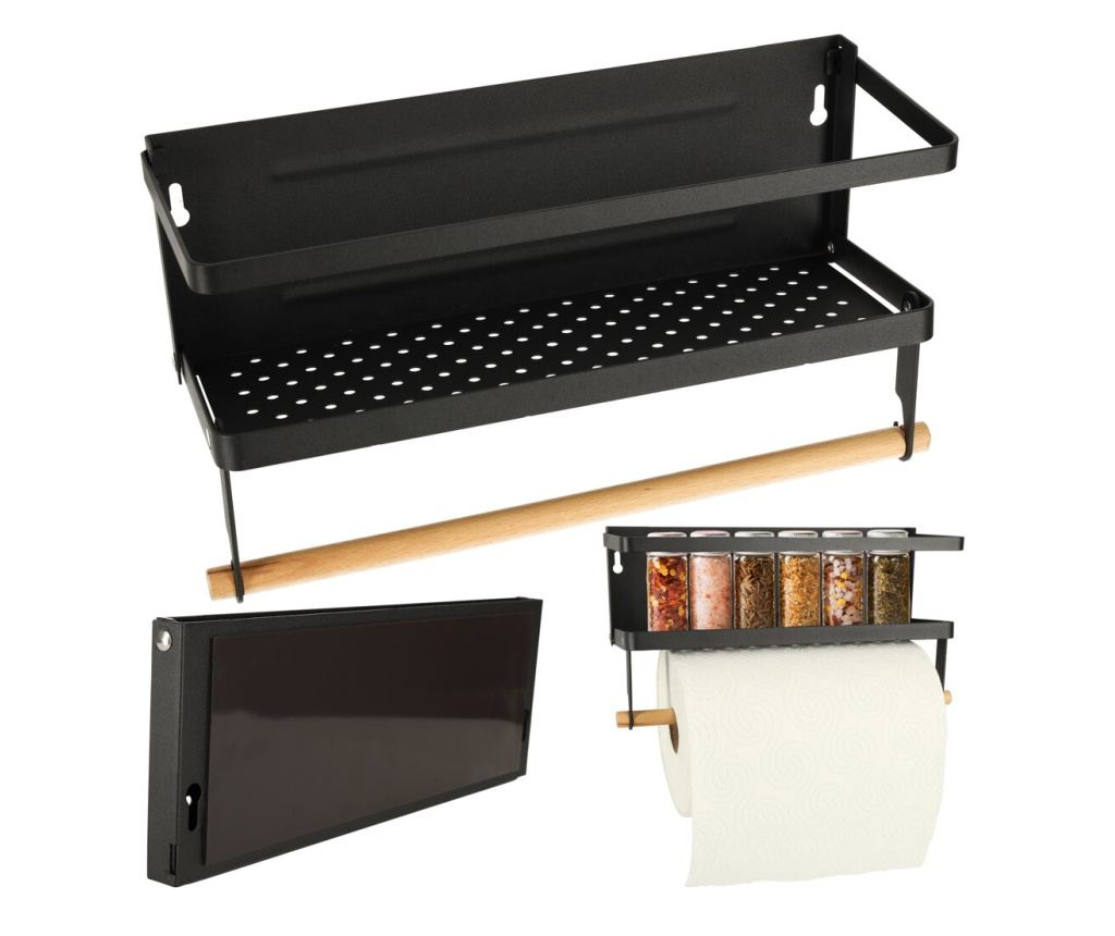 Магнитна поставка за подправки и хартиена кърпа за прикрепяне към хладилника. Благодарение на използването на силен магнит, рафтът ще се държи перфектно, дори когато е силно натоварен. Позволява ви да спестите място на кухненския плот. Минималистичният външен вид на продукта ще се впише във всяка кухня.