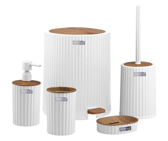 Комплект за баня Freehome OKY-450-3-B, 5 части, Бял райе/дървен