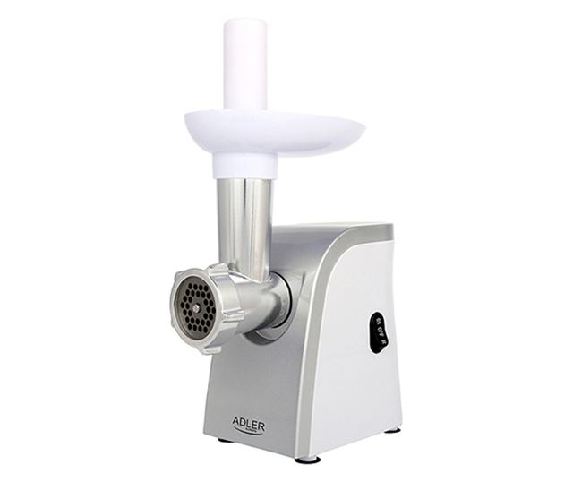 Месомелачката ADLER е солиден уред за тези, които искат сами да си приготвят колбаси и кайма. Чопърът е оборудван с три сита (малко, средно, голямо). Материалите, използвани в конструкцията на кухненския робот са издръжливи и лесни за разглобяване и почистване. Спецификации Комплект от 3 сита за нарязване: - Едно сито с диаметър 3 мм; - Сито с диаметър 5мм; - Сито с диаметър 7 мм; Аксесоар за колбаси; Превключвател за движение напред и назад; Нож от неръждаема стомана; Мощност 1500 W; Цвят: бял и сребрист; Захранване 230V, 50hz.