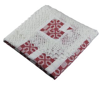 Бяла покривка за маса с червен акцент, традиционен дизайн от района на Трансилвания.