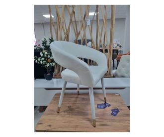 Дизайнерски трапезен стол “Бени” с бяло кадифе – модерен геометричен дизайн, ергономична облегалка с отворен гръб, метални крака с текстил и златна основа. Размери: височина на седалката 47 см, обща височина 76 см, дълбочина 43 см, ширина 41 см. Макс. тегло: 100 кг.