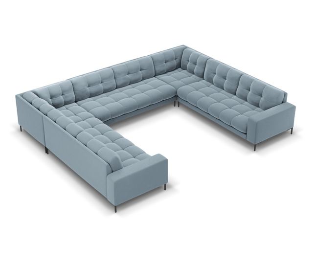 U-образен диван Cosmopolitan Design 622316. Комфорт и стил в едно. Този U-образен диван е перфектната комбинация от елегантност и функционалност за вашата всекидневна. Светлосиният му цвят и кадифената тъкан (Bluvel) добавят луксозно усещане, а лъскавите черни крака осигуряват модерен акцент. Идеален за релакс, прекарване на време с любимите хора или гледане на любимия ви филм.
