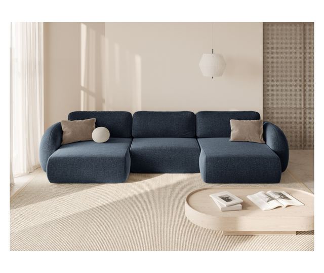 U-образен диван с функция сън Cosmopolitan Design 623500. Този елегантен U-образен диван е тапициран с мека тъмносиня Chenille материя, съчетаваща функционалност и модерен дизайн. Лесно се трансформира в удобно място за спане, идеално за гости. Използваните материали осигуряват комфорт и издръжливост.