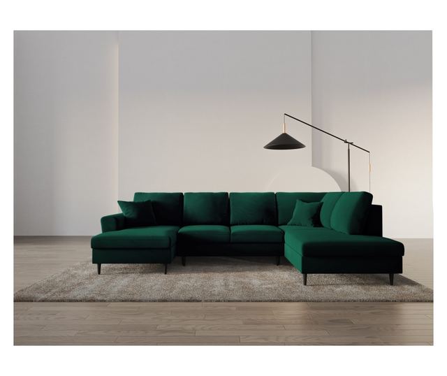 Диванът е тапициран с висококачествена тъмнозелена материя, която придава елегантност и стил на пространството. Конструкцията е изработена от масивна дървесина, а краката са от черен бук, осигуряващи стабилност и издръжливост. Диванът е проектиран с прав ъгъл, идеален за оптимизиране на пространството във вашия дом.