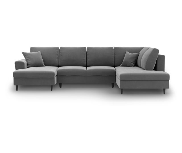 Диванът е изработен от висококачествена, светлосива материя, която е мека на допир и лесна за поддръжка. Има солидна и издръжлива конструкция с черни букови крака за стабилност и елегантност. Десният ъгъл позволява гъвкаво разположение. Размерите са оптимизирани за максимален комфорт и използване на пространството.