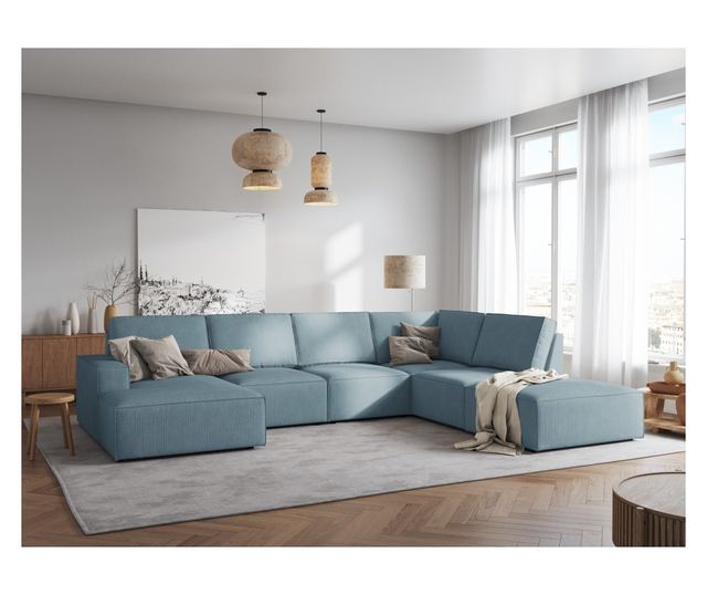 Ъгловият диван с U-образна форма Milo Casa 898087 в светлосиньо предлага перфектна комбинация от комфорт и стил за вашата всекидневна. Неговата просторна форма и елегантен дизайн го правят идеален централен елемент за общуване и релаксация. Изработен от висококачествени материали, този диван обещава дълготрайност и издръжливост.