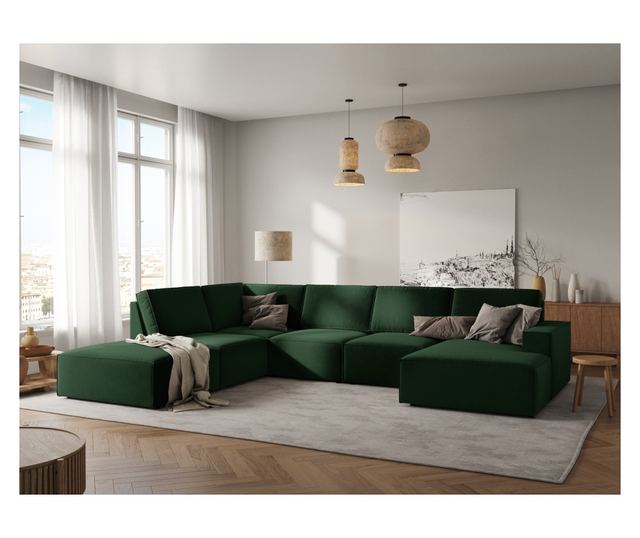 Ъгловият диван с U-образна форма Milo Casa предлага комфорт и стил. Тъмнозеленият кадифен плат придава луксозен вид на всяка всекидневна. Този ляв ъглов диван осигурява достатъчно място за сядане и релакс. Перфектен е за семейни събирания, а неговата мекота и простор ви канят да се отпуснете. Мебелите Milo Casa съчетават модерен дизайн с превъзходен комфорт, изработени от подбрани материали за издръжливост и естетика.