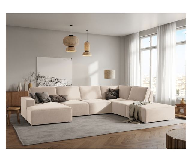 Ъгловият диван с U-образна форма Milo Casa предлага комфорт и елегантност за вашия дом. Идеален е за релакс и общуване, а неговият просторен дизайн и мека кадифена материя осигуряват изключителен комфорт. Светлобежовият цвят и елегантният дизайн добавят изтънченост към всяко пространство, превръщайки го в централен елемент за семейството и гостите.