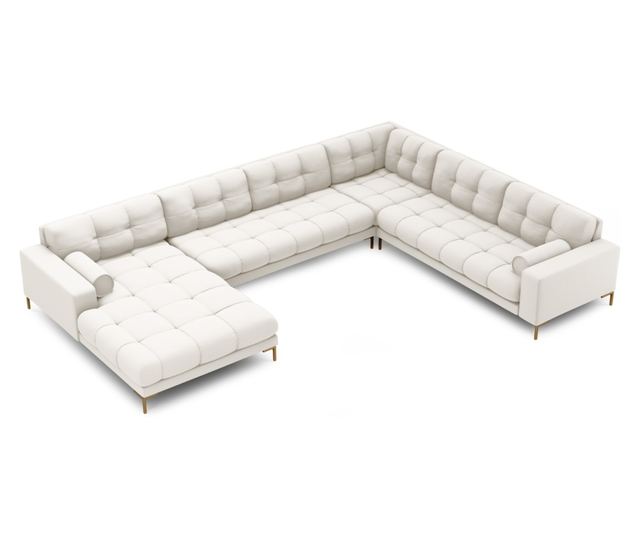 Насладете се на максимален комфорт и стил с U-образния диван Cosmopolitan Design 622212. Тапициран с елегантен, светло бежов плат с текстура (Neve), този диван въплъщава модерен дизайн. Златните крака добавят изискан щрих, който повдига визията на вашата всекидневна.