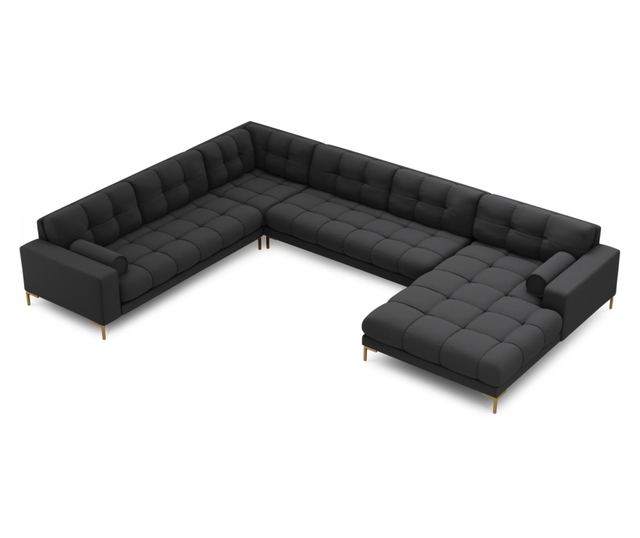 U-образен диван Cosmopolitan Design 622212. Потопете се в лукс и комфорт с ъгловия U-образен диван Cosmopolitan Design. Този елегантен диван, тапициран с висококачествена структурирана тъкан в тъмно сиво, е перфектна комбинация от стил и функционалност. Златните му крака добавят нотка изтънченост, а левият ъгъл осигурява оптимално използване на пространството.