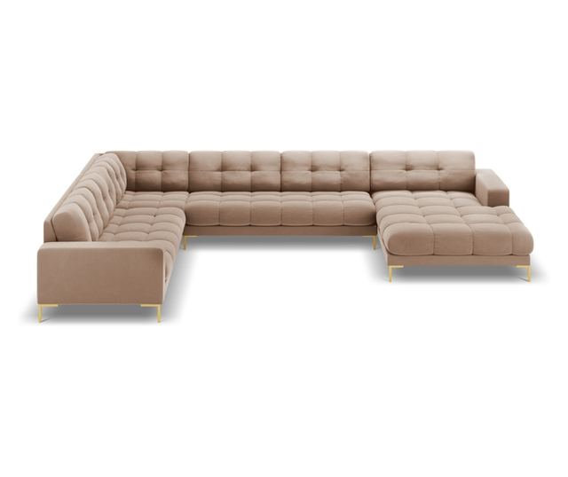 Ъглов диван Cosmopolitan Design 622212 с U-образна форма. Потопете се в лукс и комфорт с ъгловия диван Cosmopolitan Design с U-образна форма. Този елегантен диван, тапициран с мека кадифена тъкан Bluvel в изискан бежов цвят, е перфектната комбинация от стил и функционалност. Неговата просторна повърхност и модерен дизайн го правят идеален център за общуване и релакс във вашия дом.