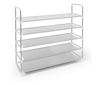 Поставете обувките си на тази практична поставка за обувки, която впечатлява със своя минимализъм. Всеки от 5-те рафта е изработен от плътно опъната вълнена материя и предлага място за 4 чифта обувки. Тя се побира във всеки коридор и антре. Рамката се състои от стоманени тръби, вмъкнати една в друга, които са много леки и същевременно изключително стабилни. Благодарение на двете странични дръжки можете да преместите поставката за обувки настрани или да я изместите настрани без никакви проблеми.