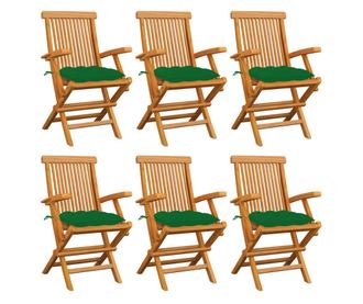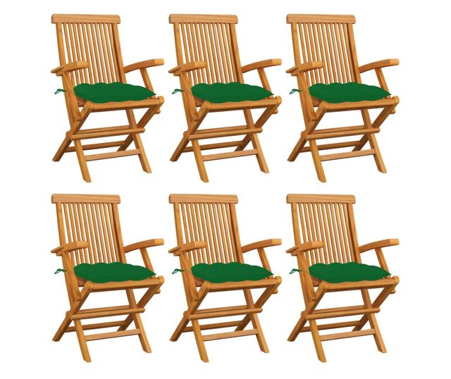 Градински столове с възглавници, 6 бр., Зелени, Масивно тиково дърво