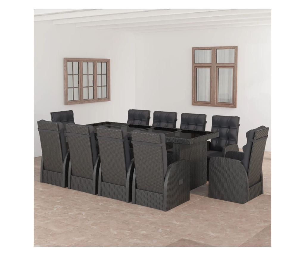 Този комплект градински мебели има здрава стоманена рамка с прахово покритие, която е особено стабилна и издръжлива. Благодарение на поли ратана, този комплект за градина е лесен за почистване, износоустойчив и подходящ за употреба на открито. Плотът на масата от стъкло се почиства лесно с влажна кърпа. Регулируемите столове предлагат максимален комфорт при сядане и отлична опора за гърба. Облегалката се регулира лесно според вашите предпочитания с помощта на страничния копче. Столовете с подложки за крака добавят допълнителен комфорт. Освен това, дебелите, меки възглавници за седалката и облегалката също са изключително удобни. Калъфите на възглавниците от полиестер са с ниска поддръжка и могат лесно да се свалят и перат.
