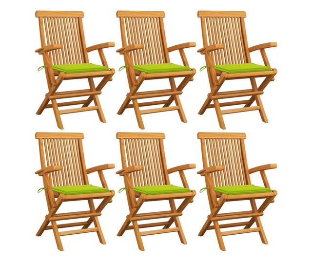 Градински столове със светлозелени възглавници, 6 бр., Масивно тиково дърво