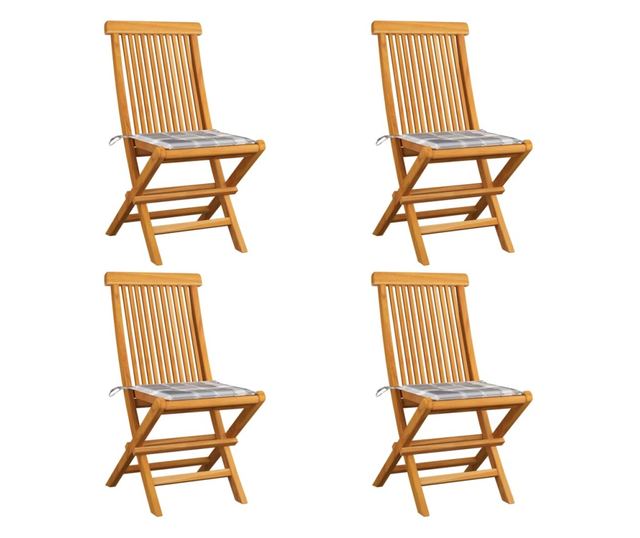 Градински столове, сиви карирани възглавници, 4 бр., Масивно дърво тиково дърво