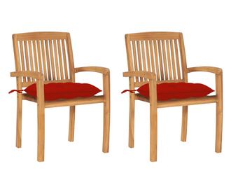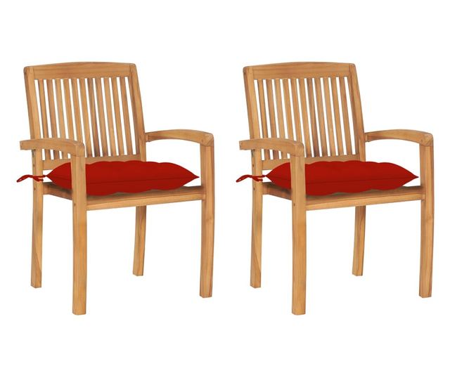 Градински столове с червени възглавници, 2 бр., Масивно тиково дърво