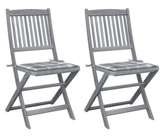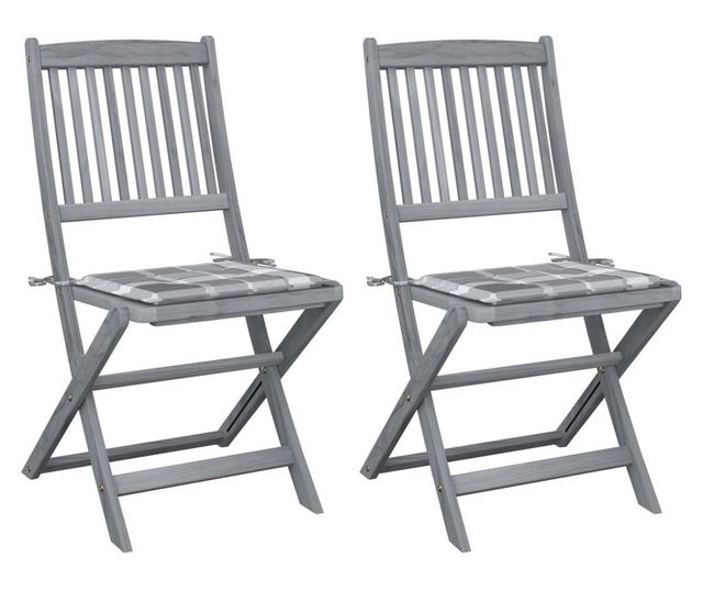 Тези трапезни столове са изработени от масивна акациева дървесина, тропическа твърда дървесина, което ги прави устойчиви на атмосферни влияния и издръжливи за години употреба. Масивната акациева дървесина има здравина, за да издържи тегло и износване във времето. Сивата повърхност е лесна за почистване с влажна кърпа. Столовете могат да се сгъват, за да спестят място, когато не се използват. Освен това включените възглавници осигуряват допълнителен комфорт, докато релаксирате или се храните. Всяка възглавница има два комплекта връзки за по-добро закрепване към стола.