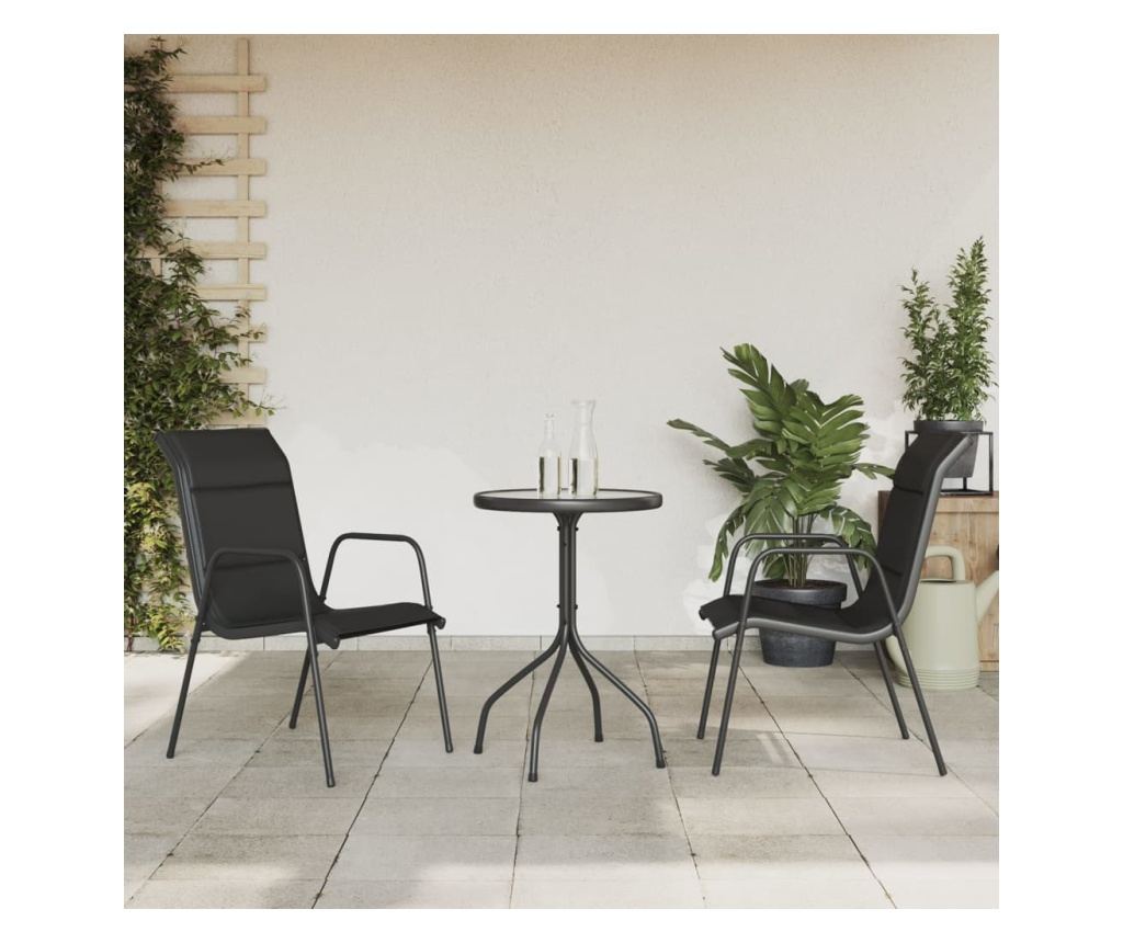 - Стабилна рамка: Градинският стол и масата имат стоманена конструкция, което ги прави здрави и стабилни.