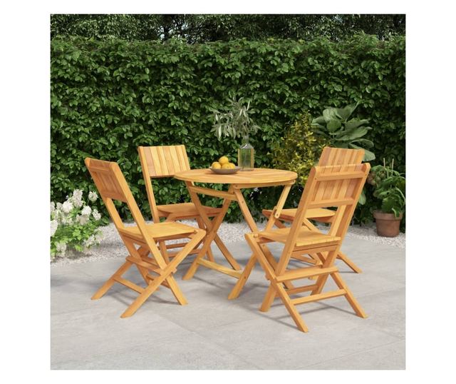 - Масивно тиково дърво: Този комплект мебели е изработен от масивно тиково дърво. Масивното тиково дърво е красив естествен материал. То е изсушено във фурна естествено и след това фино шлайфано, за да му придаде много гладък вид. Тиковото дърво е известно със своята изключителна здравина и устойчивост на атмосферни влияния.