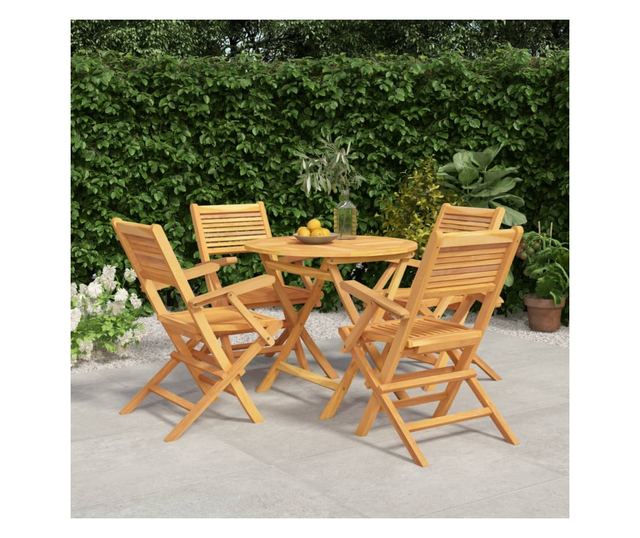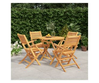 - Масивно тиково дърво: Този комплект мебели е изработен от масивно тиково дърво. Масивното тиково дърво е красив естествен материал. То е изсушено във фурна естествено и след това фино шлайфано, за да му се придаде много гладко покритие. Тиковото дърво е известно със своята изключителна здравина и устойчивост на атмосферни влияния.