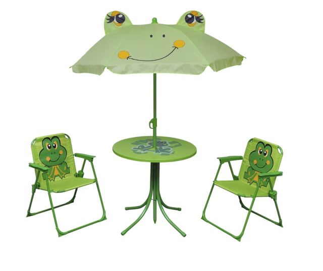 Със здрава стоманена рамка, този комплект градински мебели е издръжлив и ще създаде безопасно място за почивка на вашите деца. Включеният чадър ще предпази малките ви от слънцето. Столовете могат да се сгъват, за да спестят място, когато не се използват.