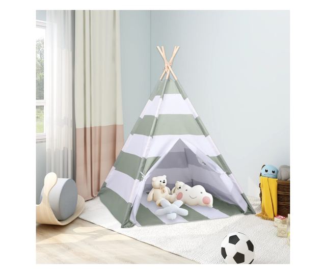 Тази палатка тип "типи" за деца с размери 120x120x150 см предлага достатъчно място за игра отвътре. Къщичката за игра има здрава рамка от борова дървесина, което я прави здрава и стабилна на земята. Дизайнът с райета я прави привлекателна за малките. Покривалото на палатката е изработено от издръжлива материя тип "прасковена кожа" за дългогодишна употреба. Има и прозорец отстрани за наблюдение на децата. Можете лесно да съхранявате палатката в включената чанта за носене, когато не се използва или когато я изнасяте навън.
