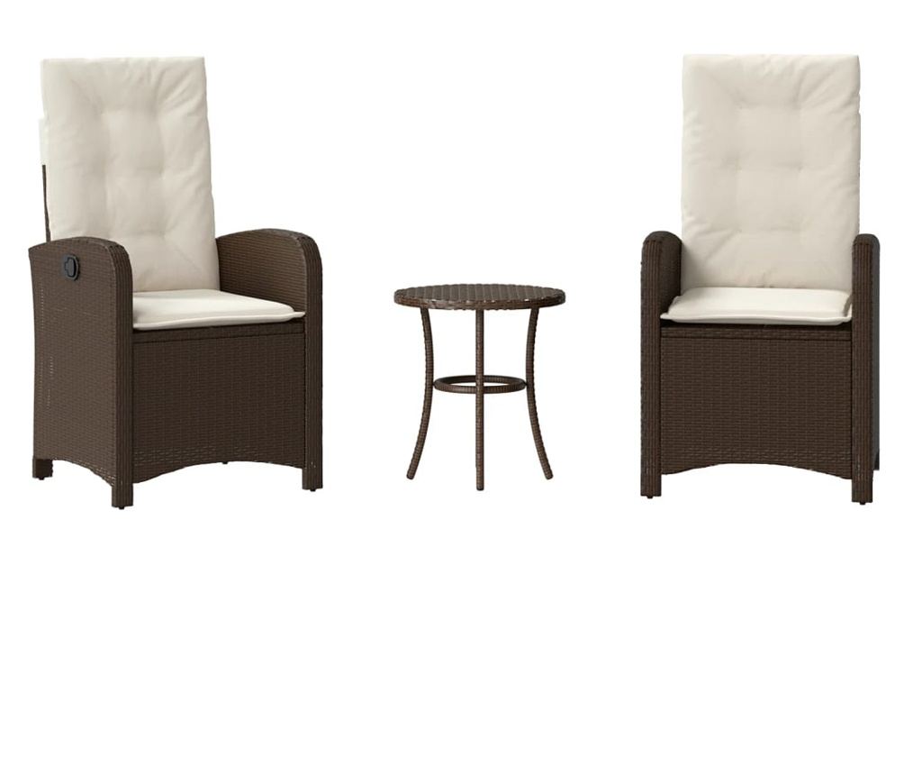 Насладете се на кафе или поговорете със семейството и приятелите си в градината, задния двор или на балкона с този удобен комплект за бистро! Издръжлив материал: PE ратан, известен също като полиратан, е здрав синтетичен материал с малко необходима поддръжка, който прилича на естествен ратан. Той е лек, лесен за почистване и често се използва за външни мебели поради своята издръжливост и устойчивост на атмосферни влияния.Регулируема облегалка: Тази градинска мебел има дръжка от дясната страна. Можете да регулирате облегалката във всяка позиция чрез издърпване на дръжката. Можете също бързо да върнете облегалката в първоначалното ѝ положение с дръжката.Удобна седалка: Този комплект мебели за открито, снабдени с плътно подплатени възглавници, предлага удобство при сядане.Калъф, който може да се сваля и може да се пере: Тези възглавници за седалки имат подвижни калъфи за лесно пране и поддръжка.Здрава и стабилна рамка: Стоманената рамка с прахово покритие гарантира, че градинската мебел е здрава и стабилна за ежедневна употреба на открито. Добре е да се знае:За да сте сигурни, че вашите външни мебели ще останат красиви, ви препоръчваме да ги защитите с водоустойчиво покривало.