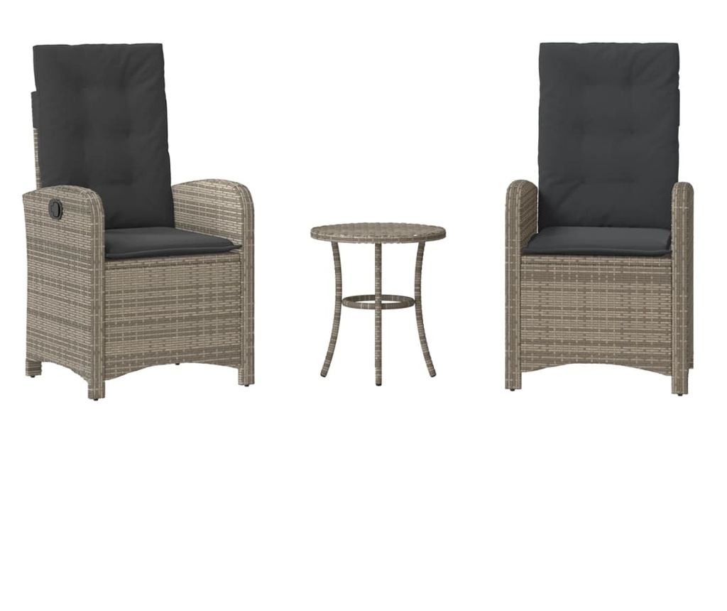 Насладете се на кафе или поговорете със семейството и приятелите си в градината, задния двор или на балкона с този удобен комплект за бистро! Издръжлив материал: PE ратан, известен също като полиратан, е здрав синтетичен материал с малко необходима поддръжка, който прилича на естествен ратан. Той е лек, лесен за почистване и често се използва за външни мебели поради своята издръжливост и устойчивост на атмосферни влияния.Регулируема облегалка: Тази градинска мебел има дръжка от дясната страна. Можете да регулирате облегалката във всяка позиция чрез издърпване на дръжката. Можете също бързо да върнете облегалката в първоначалното ѝ положение с дръжката.Удобна седалка: Този комплект мебели за открито, снабдени с плътно подплатени възглавници, предлага удобство при сядане.Калъф, който може да се сваля и може да се пере: Тези възглавници за седалки имат подвижни калъфи за лесно пране и поддръжка.Здрава и стабилна рамка: Стоманената рамка с прахово покритие гарантира, че градинската мебел е здрава и стабилна за ежедневна употреба на открито. Добре е да се знае:За да сте сигурни, че вашите външни мебели ще останат красиви, ви препоръчваме да ги защитите с водоустойчиво покривало.